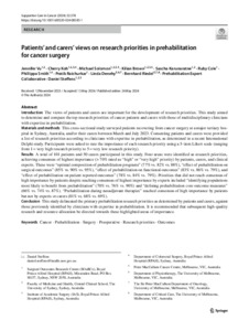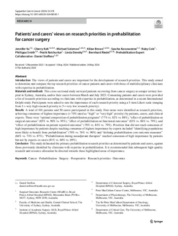 VU, Jennifer, KOH, Cherry, SOLOMON, Michael, BROWN, Kilian, KARUNARATNE, Sascha, COLE, Ruby, SMITH, Phillippa, RAICHURKAR, Pratik, DENEHY, Linda, RIEDEL, Bernhard, PREHABILITATION EXPERT COLLABORATIVE and STEFFENS, Daniel (2024). Patients' and carers' views on research priorities in prehabilitation for cancer surgery. Supportive care in cancer : official journal of the Multinational Association of Supportive Care in Cancer, 32 (6), p. 378. [Article]
