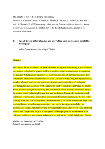 POWER-ANNAND, Adam and HACKETT, Abigail (2025). Speech Bubbles : How play, joy, and storytelling open up expansive possibilities for language. In: BADWAN, Khawla, DOWER, Ruth Churchill, FARAH, Warda, FLEWITT, Rosie, HACKETT, Abigail, HOLMES, Rachel, MACRAE, Christina, NAIR, Vishnu KK and SHANNON, David Ben, (eds.) Language, Place, and the Body in Childhood Literacies. Routledge, 70-79. [Book Section]