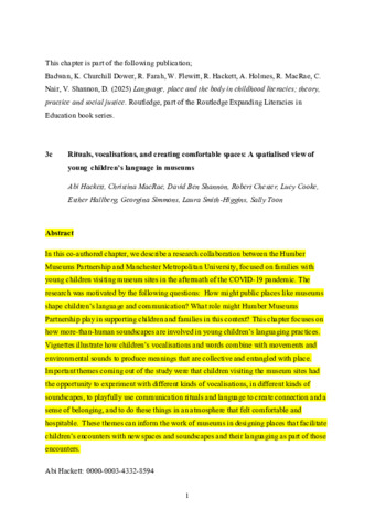 HACKETT, Abigail, MACRAE, Christina, SHANNON, David Ben, CHESTER, Robert, COOKE, Lucy, HALLBERG, Esther, SIMMONS, Georgina, SMITH-HIGGINS, Laura and TOON, Sally (2025). Rituals, vocalisations, and creating comfortable spaces: A spatialised view of young children’s language in museums. In: BADWAN, Khawla, DOWER, Ruth Churchill, FARAH, Warda, FLEWITT, Rosie, HACKETT, Abigail, HOLMES, Rachel, MACRAE, Christina, NAIR, Vishnu KK and SHANNON, David Ben, (eds.) Language, Place, and the Body in Childhood Literacies. Routledge, 119-130. [Book Section]