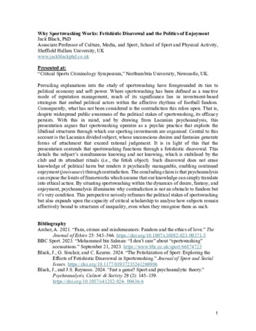 BLACK, Jack (2025). Why Sportswashing Works: Fetishistic Disavowal and the Politics of Enjoyment [abstract only]. In: Critical Sports Criminology Symposium, Newcastle, UK, 10 Dec 2025. (Unpublished) [Conference or Workshop Item]