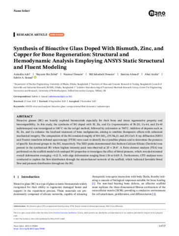 ADRI, Anindita, ZAHID, Nayeem Bin, HOSSAIN, Nazmul, HOSSAIN, Md Sahadath, AHMED, Samina, ARAFAT, Abul and SAMAD, Sabrin A (2025). Synthesis of Bioactive Glass Doped With Bismuth, Zinc, and Copper for Bone Regeneration: Structural and Hemodynamic Analysis Employing ANSYS Static Structural and Fluent Modeling. Nano Select. [Article]
