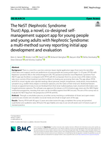 SALEEM, Moin A, COOK, Wendy, COOK, David, DAMGHANI, Reihaneh, AFZAL, Maryam, STEENKAMP, Retha, DONOVAN, Steve and SWALLOW, Veronica (2025). The NeST (Nephrotic Syndrome Trust) App, a novel, co-designed self-management support app for young people and young adults with Nephrotic Syndrome: a multi-method survey reporting initial app development and evaluation. BMC Nephrology, 27: 52. [Article]
