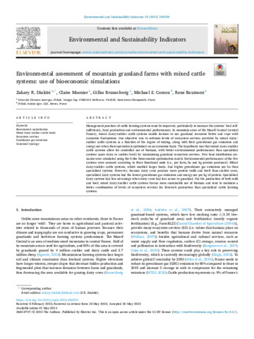 DIAKITÉ, Zakary, MOSNIER, Claire, BRUNSCHWIG, Gilles, CORSON, Michael S and BAUMONT, René (2023). Environmental assessment of mountain grassland farms with mixed cattle systems: use of bioeconomic simulations. Environmental and Sustainability Indicators, 19: 100259. [Article]