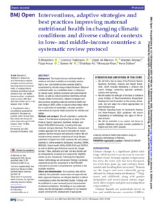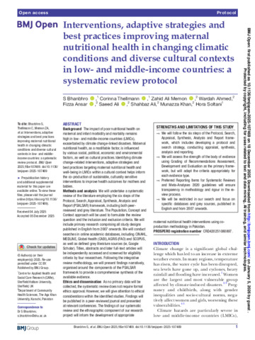 BHANBHRO, Sadiq, THELLMANN, Corinna, MEMON, Zahid Ali, AHMED, Wardah, ANSAR, Fizza, ALI, Saeed, ALI, Shahbaz, KHAN, Munazza and SOLTANI, Hora (2025). Interventions, adaptive strategies and best practices improving maternal nutritional health in changing climatic conditions and diverse cultural contexts in low- and middle-income countries: a systematic review protocol. BMJ Open, 15 (12), bmjopen-2025. [Article]