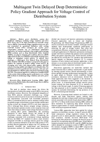 RIAZ, Hafiz Mehboob, SAJJAD, Malik Intisar Ali and AKMAL, Muhammad (2025). Multiagent Twin Delayed Deep Deterministic Policy Gradient Approach for Voltage Control of Distribution System. In: 2025 60th International Universities Power Engineering Conference (UPEC). IEEE, 1-6. [Book Section]