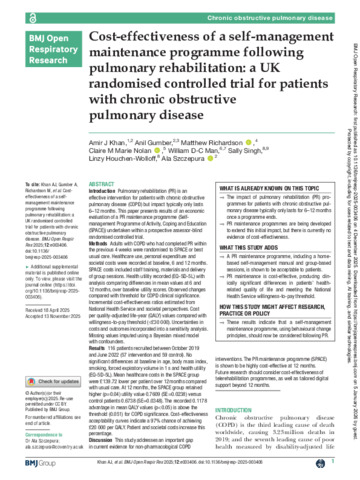 KHAN, Amir J, GUMBER, Anil, RICHARDSON, Matthew, NOLAN, Claire M Marie, MAN, William D-C, SINGH, Sally, HOUCHEN-WOLLOFF, Linzy and SZCZEPURA, Ala (2025). Cost-effectiveness of a self-management maintenance programme following pulmonary rehabilitation: a UK randomised controlled trial for patients with chronic obstructive pulmonary disease. BMJ Open Respiratory Research, 12 (1). [Article]
