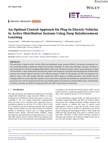 TAHIR, Yameena, NADEEM, Muhammad Faisal, RAZA, Muhammad Bilal and AKMAL, Muhammad (2026). An Optimal Control Approach for Plug-In Electric Vehicles in Active Distribution Systems Using Deep Reinforcement Learning. IET Smart Grid, 9 (1): e70051. [Article]