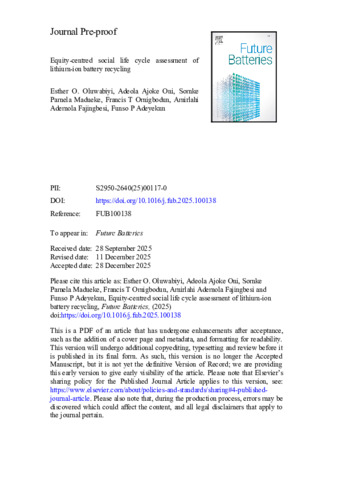 OLUWABIYI, Esther, ONI, Adeola, MADUEKE, Somke, OMIGBODUN, Francis, FAJINGBESI, Amirlahi and ADEYEKUN, Funso (2025). Equity-centred social life cycle assessment of lithium-ion battery recycling. Future Batteries: 100138. [Article]