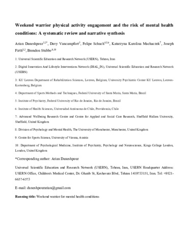 DANESHPOUR, Arian, VANCAMPFORT, Davy, SCHUCH, Felipe, MACHACZEK, Katarzyna, FIRTH, Joseph and STUBBS, Brendon (2026). Weekend warrior physical activity engagement and the risk of mental health conditions: A systematic review and narrative synthesis. Mental Health and Physical Activity, 30: 100746. [Article]