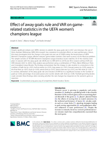 STONE, Joseph, KUBAYI, Alliance and ARMATAS, Vasilis (2025). Effect of away goals rule and VAR on game-related statistics in the UEFA women’s champions league. BMC Sports Science, Medicine and Rehabilitation, 18 (1): 2. [Article]