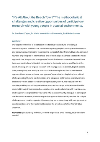 LOMAX, Helen, BOND-TAYLOR, Sue and ALFARO-SIMMONDS, Maria Jesus (2025). “It’s All About the Beach Town!” The methodological challenges and creative opportunities of participatory research with young people in coastal environments. Coastal Studies & Society. [Article]