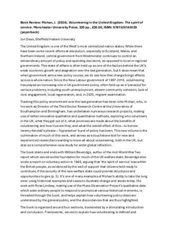 DEAN, Jon (2025). Book Review: Volunteering in the United Kingdom: The spirit of service, by Mohan, J. Nonprofit and Voluntary Sector Quarterly. [Article]