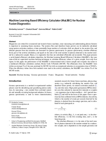 LENNON, Kimberley, SHAND, Chantal, WILSON, Gemma and SMITH, Robin (2026). Machine Learning Based Efficiency Calculator (MaLBEC) for Nuclear Fusion Diagnostics. Journal of Fusion Energy, 45 (1): 6. [Article]