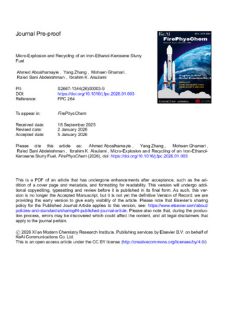 ABOALHAMAYIE, Ahmed, ZHANG, Yang, GHAMARI, Mohsen, BANI ABDELRAHMAN, Ra'ed and ALSULAMI, Ibrahim K. (2026). Micro-Explosion and Recycling of an Iron-Ethanol-Kerosene Slurry Fuel. FirePhysChem. [Article]