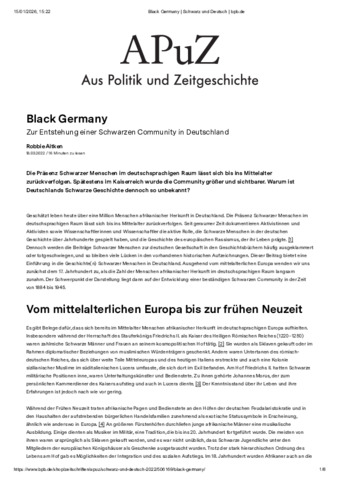 AITKEN, Robbie (2022). Black Germany. Zur Entstehung einer Schwarzen Community in Deutschland. Aus Politik und Zeitgeschichte (12), 4-10. [Article]