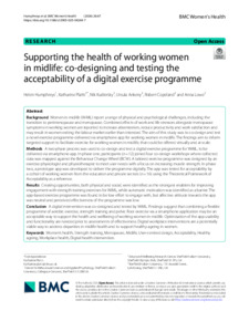 HUMPHREYS, Helen, PLATTS, Katharine, KUDIERSKY, Nik, ANKENY, Ursula, COPELAND, Robert and LOWE, Anna (2026). Supporting the health of working women in midlife: co-designing and testing the acceptability of a digital exercise programme. BMC women's health, 26: 67. [Article]