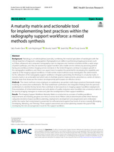 The mixed methods study employed an explanatory sequential, multi-stage advanced framework design, involving six consecutive workstreams. The final workstream synthesised and integrated findings from the previous workstreams to identify the key factors that contribute to best practices in imaging support workforce deployment. Documentation of critical determinants and articulation of quality indicators were modelled into a maturity matrix to be used by imaging managers to review and plan the development of their support workforce.Results
