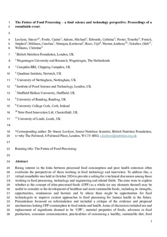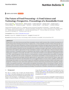 LOCKYER, Stacey, FORDE, Ciarán, ADAMS, Michael, EDWARDS, Cathrina, FOSTER, Timothy, FRENCH, Stephen, MILLMAN, Caroline, NIRANJAN, Keshavan, ROOS, Yrjö, WARNER, Anthony, YAKUBOV, Gleb and WILLIAMS, Christine (2026). The Future of Food Processing—A Food Science and Technology Perspective. Proceedings of a Roundtable Event. Nutrition Bulletin. [Article]