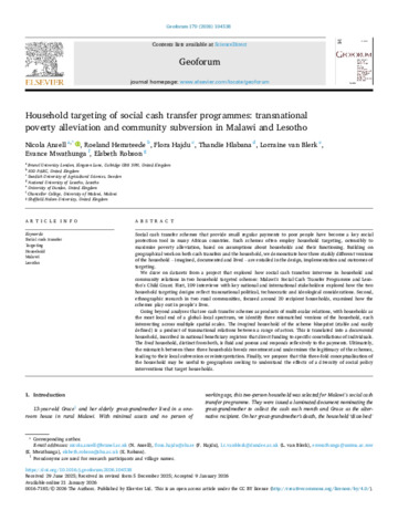 ANSELL, Nicola, HEMSTEEDE, Roeland, HAJDU, Flora, HLABANA, Thandie, VAN BLERK, Lorraine, MWATHUNGA, Evance and ROBSON, Elsbeth (2026). Household targeting of social cash transfer programmes: transnational poverty alleviation and community subversion in Malawi and Lesotho. Geoforum, 170: 104538. [Article]