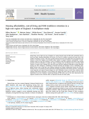 NEWTON, Dillon, ZARJOO, Mariam, BROWN, Philip, SIMCOCK, Tom, GARSIDE, Joanne, STEPHENSON, John, EASTBURN, Sara, PRESSLEY, Charlene, FERRARI, Edward, LEATHER, David and GORE, Tony (2026). Housing affordability, cost-of-living and NHS workforce retention in a high-cost region of England: A multiphase study. SSM - Health Systems, 6: 100175. [Article]