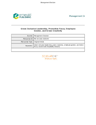 OREKOYA, Ibrahim, OLABODE, Oluwaseun Eniola, ADEBIYI, Sulaimon Olanrewaju and SOETANTO, Danny (2026). Green Inclusive Leadership, Promotion Focus, Employee Gender, and Green Creativity. Management Decision. [Article]