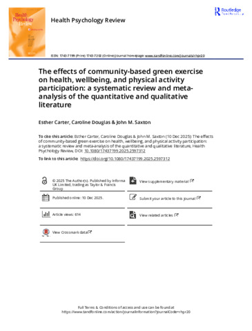 CARTER, Esther, DOUGLAS, Caroline and SAXTON, John M (2025). The effects of community-based green exercise on health, wellbeing, and physical activity participation: a systematic review and meta-analysis of the quantitative and qualitative literature. Health psychology review. [Article]