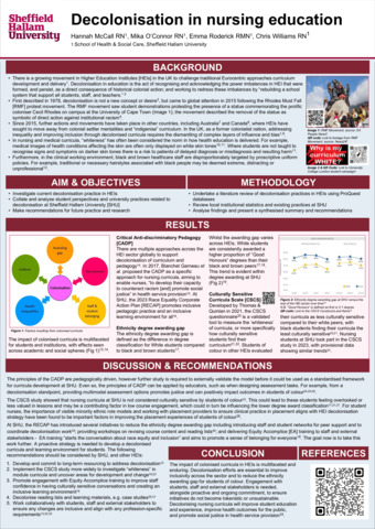 MCCALL, Hannah, O'CONNOR, Mika, RODERICK, Emma and WILLIAMS, Christopher (2025). Decolonisation in nursing education. In: Sheffield Teaching Hospitals Nursing & Midwifery Conference, Sheffield, UK. (Unpublished) [Conference or Workshop Item]
