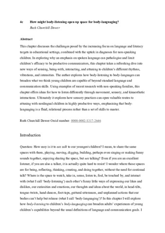 CHURCHILL DOWER, Ruth (2025). How might body-listening open up space for body-languaging? In: CHURCHILL DOWER, Ruth, HACKETT, Abigail, BADWAN, Khawla, FARAH, Warda, FLEWITT, Rosie, HOLMES, Rachel, MACRAE, Christina, NAIR, Vishnu KK and SHANNON, David Ben, (eds.) Language, Place, and the Body in Childhood Literacies. Routledge, 181-196. [Book Section]