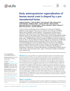 GOGOLOU, Antigoni, SOUILHOL, Celine, GRANATA, Ilaria, WYMEERSCH, Filip J, MANIPUR, Ichcha, WIND, Matthew, FRITH, Thomas JR, GUARINI, Maria, BERTERO, Alessandro, BOCK, Christoph, HALBRITTER, Florian, TAKASATO, Minoru, GUARRACINO, Mario R and TSAKIRIDIS, Anestis (2022). Early anteroposterior regionalisation of human neural crest is shaped by a pro-mesodermal factor. eLife, 11: e72463. [Article]
