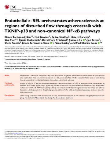 TARDAJOS AYLLON, Blanca, BOWDEN, Neil, SOUILHOL, Celine, DARWISH, Hazem, TIAN, Siyu, DUCKWORTH, Carrie, PRITCHARD, David Mark, XU, Suowen, SAYERS, Jon, FRANCIS, Sheila, SERBANOVIC-CANIC, Jovana, OAKLEY, Fiona and EVANS, Paul Charles (2025). Endothelial c-REL orchestrates atherosclerosis at regions of disturbed flow through crosstalk with TXNIP-p38 and non-canonical NF-κB pathways. Cardiovascular Research, 121 (5), 748-759. [Article]