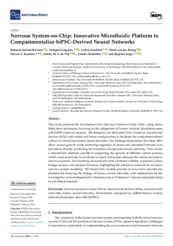 SABAHI-KAVIANI, Rahman, GOGOLOU, Antigoni, SOUILHOL, Celine, VAN DER KROEG, Mark, KUSHNER, Steven A, DE VRIJ, Femke MS, TSAKIRIDIS, Anestis and LUTTGE, Regina (2026). Nervous System-on-Chip: Innovative Microfluidic Platform to Compartmentalize hiPSC-Derived Neural Networks. Micromachines, 17 (2): 199. [Article]