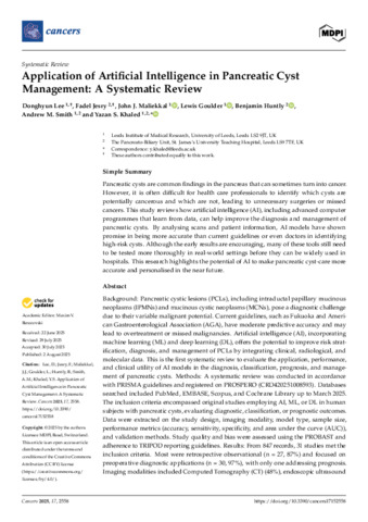 LEE, Donghyun, JESRY, Fadel, MALIEKKAL, John J, GOULDER, Lewis, HUNTLY, Benjamin, SMITH, Andrew M and KHALED, Yazan S (2025). Application of Artificial Intelligence in Pancreatic Cyst Management: A Systematic Review. Cancers, 17 (15), p. 2558. [Article]