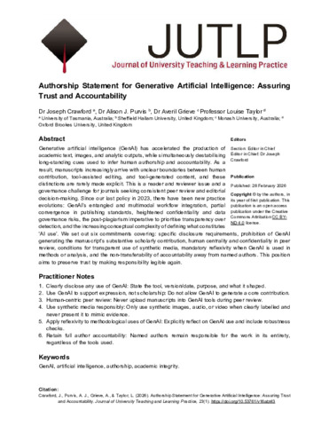 CRAWFORD, Joseph, PURVIS, Alison, GRIEVE, Averil and TAYLOR, Louise (2026). Authorship Statement for Generative Artificial Intelligence: Assuring Trust and Accountability [Editorial]. Journal of University Teaching and Learning Practice. [Article]
