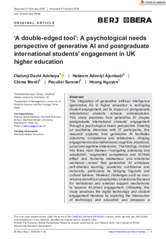 ADEKOYA, Olatunji, AJONBADI, Hakeem, MORDI, Chima, SAMUEL, Peculiar and NGUYEN, Hoang (2026). "A double-edged tool”: A psychological needs perspective of generative AI and postgraduate international students’ engagement in UK higher education. British Educational Research Journal (BERJ). [Article]