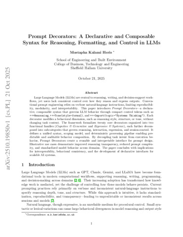 HERIS, Mostapha (2025). Prompt Decorators: A Declarative and Composable Syntax for Reasoning, Formatting, and Control in LLMs. [Pre-print] (Unpublished) [Pre-print]
