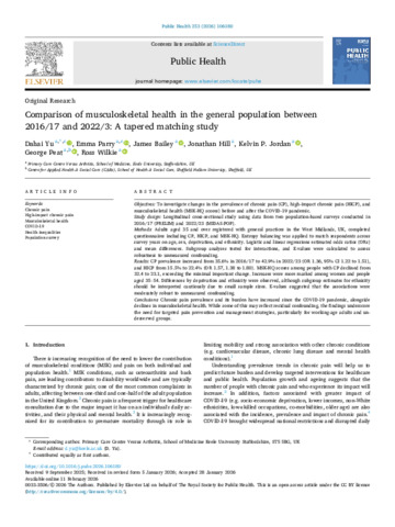 YU, Dahai, PARRY, Emma, BAILEY, James, HILL, Jonathan, JORDAN, Kelvin P, PEAT, George and WILKIE, Ross (2026). Comparison of musculoskeletal health in the general population between 2016/17 and 2022/3: A tapered matching study. Public Health, 253: 106180. [Article]