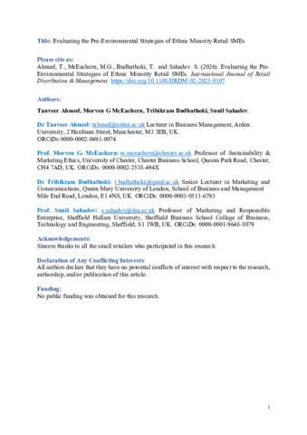 AHMED, Tanveer, MCEACHERN, Morven G, BUDHATHOKI, Tribikram and SAHADEV, Sunil (2026). Evaluating the pro-environmental strategies of ethnic minority retail SMEs. International Journal of Retail & Distribution Management, 1-14. [Article]