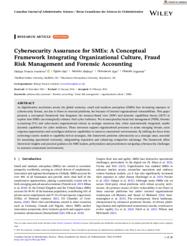 AWOLOWO, Francis, ODE, Egena, ABIDOYE, Adenike, AJAO, Oluwaseun and JOGUNOLA, Olamide (2026). Cybersecurity Assurance for SMEs: A Conceptual Framework Integrating Organizational Culture, Fraud Risk Management and Forensic Accounting. Canadian Journal of Administrative Sciences / Revue Canadienne des Sciences de l'Administration, 43 (1). [Article]