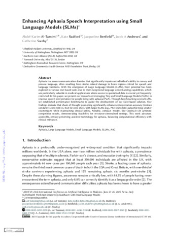 AL TAMIMI, Abdel-Karim, RADFORD, K, BENFIELD, J, ANDREWS, JA and SWEBY, C (2025). Enhancing Aphasia Speech Interpretation using Small Language Models (SLMs). Ceur Workshop Proceedings, 3985: 2, 10-18. [Article]