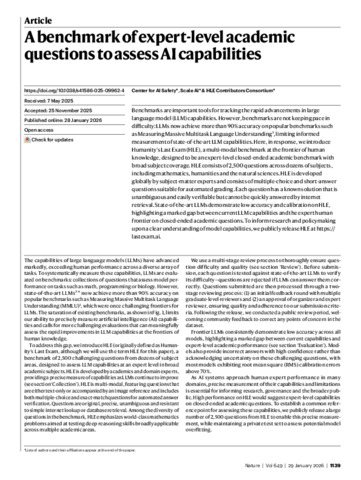 CENTER FOR AI SAFETY, SCALE AI and HLE CONTRIBUTORS CONSORTIUM (2026). A benchmark of expert-level academic questions to assess AI capabilities. Nature, 649, 1139-1146. [Article]