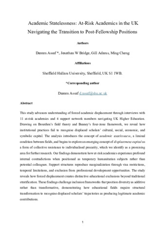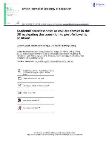 ASSAF, Dareen, BRIDGE, Jonathan, ADAMS, Gill and CHENG, Ming (2026). Academic Statelessness: At-Risk Academics in the UK Navigating the Transition to Post-Fellowship Positions. British Journal of Sociology of Education. [Article]