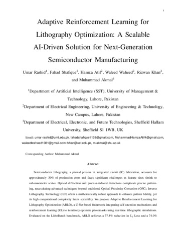 RASHID, Umar, SHAFIQUE, Fahad, ATIF, Hamza, WAHEED, Waleed, KHAN, Rizwan and AKMAL, Muhammad (2026). Adaptive Reinforcement Learning for Lithography Optimization: A Scalable AI-Driven Solution for Next-Generation Semiconductor Manufacturing. Scientific Reports. [Article]