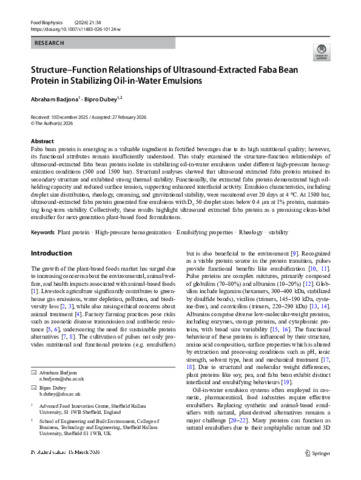 BADJONA, Abraham and DUBEY, Bipro (2026). Structure–Function Relationships of Ultrasound-Extracted Faba Bean Protein in Stabilizing Oil-in-Water Emulsions. Food Biophysics, 21 (2): 34. [Article]