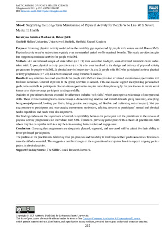 MACHACZEK, Katarzyna and QUIRK, Helen (2026). S16-4: Supporting the Long-Term Maintenance of Physical Activity for People Who Live With Severe Mental Ill Health [Abstract only]. Baltic Journal of Sport and Health Sciences, 5 (Supple), p. 292. [Article]