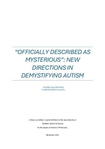 PRICE, Thomas William (2024). “Officially Described as Mysterious”: New Directions in Demystifying Autism. Doctoral, Sheffield Hallam University. [Thesis]