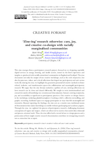 WONG, Mark, MISHRA, Ankita and QUYOUM, Aunam (2026). ‘Zine-ing’ research otherwise: care, joy, and creative co-design with racially marginalised communities. Journal of Creative Research Methods, 1-34. [Article]