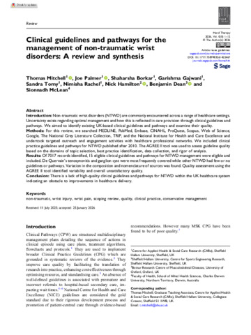 MITCHELL, Thomas, PALMER, Joe, BORKAR, Shaharsha, GAJWANI, Garishma, TOMY, Sandra, RACHEL, Nimisha, HAMILTON, Nick, DEAN, Benjamin and MCLEAN, Sionnadh (2026). Clinical guidelines and pathways for the management of non-traumatic wrist disorders: A review and synthesis. Hand therapy. [Article]