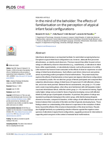 HUNT, Ben, RAYSON, Holly, BANNARD, Colin and DE PASCALIS, Leonardo (2023). In the mind of the beholder: The effects of familiarisation on the perception of atypical infant facial configurations. PloS one, 18 (7): e0289057. [Article]