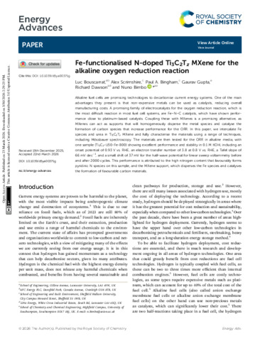 BOUSCARRAT, Luc, SCRIMSHIRE, Alex, BINGHAM, Paul, GUPTA, Gaurav, DAWSON, Richard and BIMBO, Nuno (2026). Fe-functionalised N-doped Ti 3 C 2 T z MXene for the alkaline oxygen reduction reaction. Energy Advances. [Article]