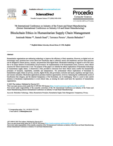 MAINA, Jemimah, SAAD, Sameh, PERERA, Terrence and BAHADORI, Ramin (2026). Blockchain Ethics in Humanitarian Supply Chain Management. Procedia Computer Science, 277, 2428-2436. [Article]